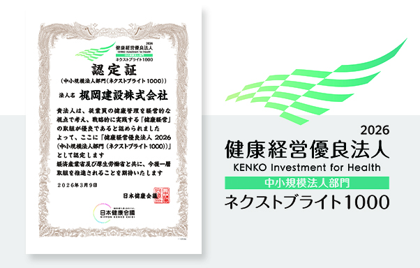 梶岡建設では2018年7月、全国健康保険協会岡山支部様が実施する「健活企業宣言」に基づき、積極的に心と体の健康づくりに取り組み、従業員の健康増進を図る企業であると認定されました。