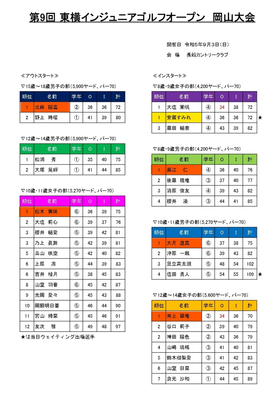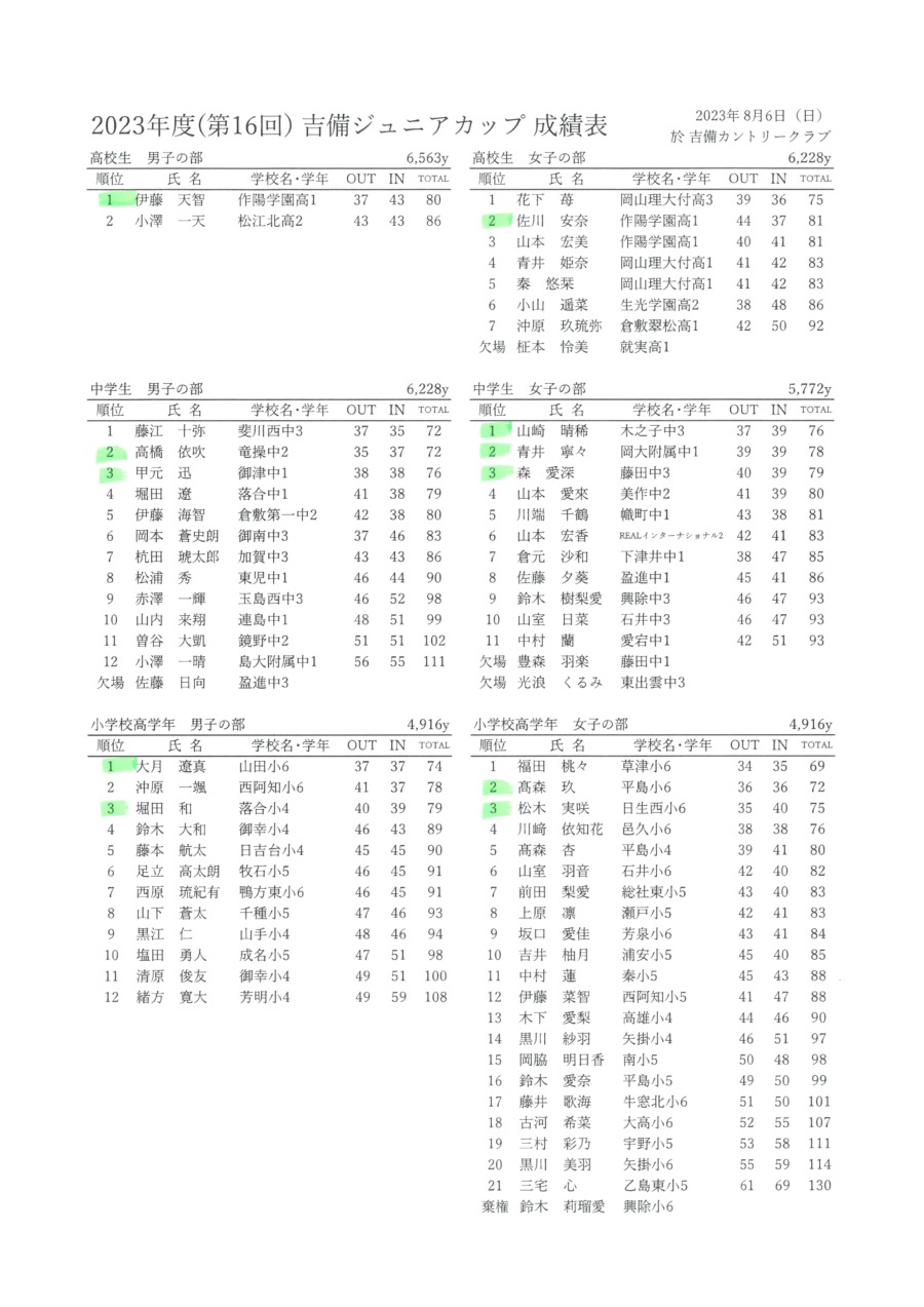 第24回岡山県ジュニアゴルフ選手権競技 各部門1位~3位
