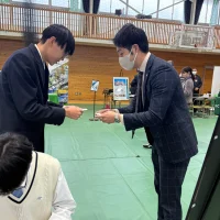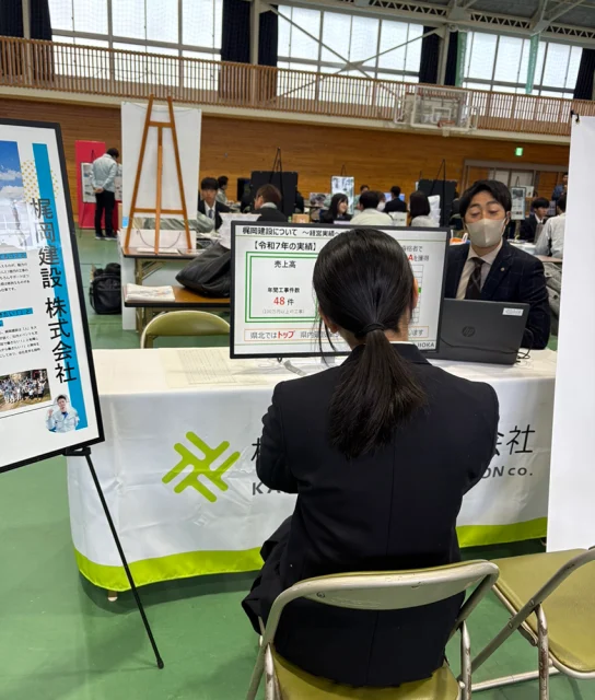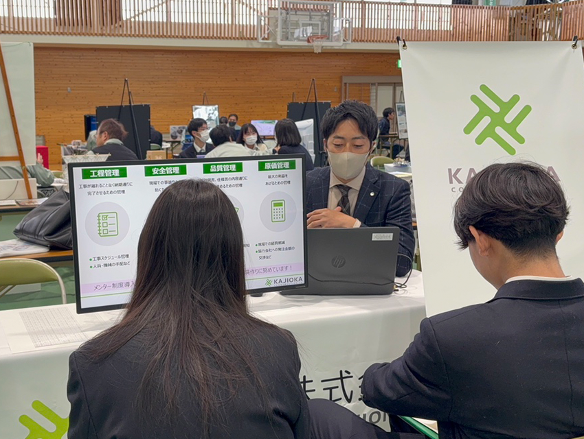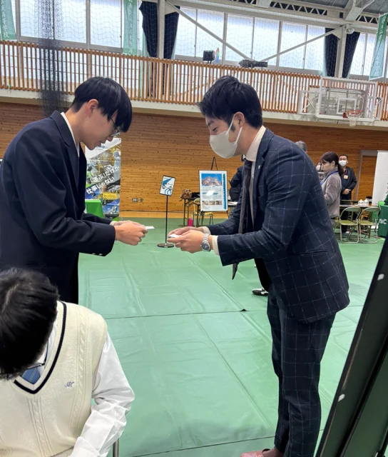 梶岡建設のブースに来られた生徒と名刺交換や、会社の説明だけでなく建設業ではどんな仕事を行っているのかなどを説明させていただきました。生徒の皆さんは説明を熱心に聞き、メモを取ったり積極的に質問したりと、非常に意欲的な姿勢が印象的でした。