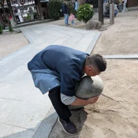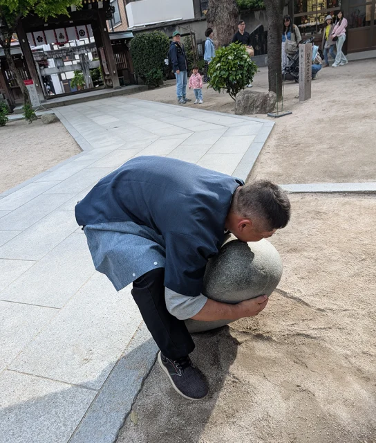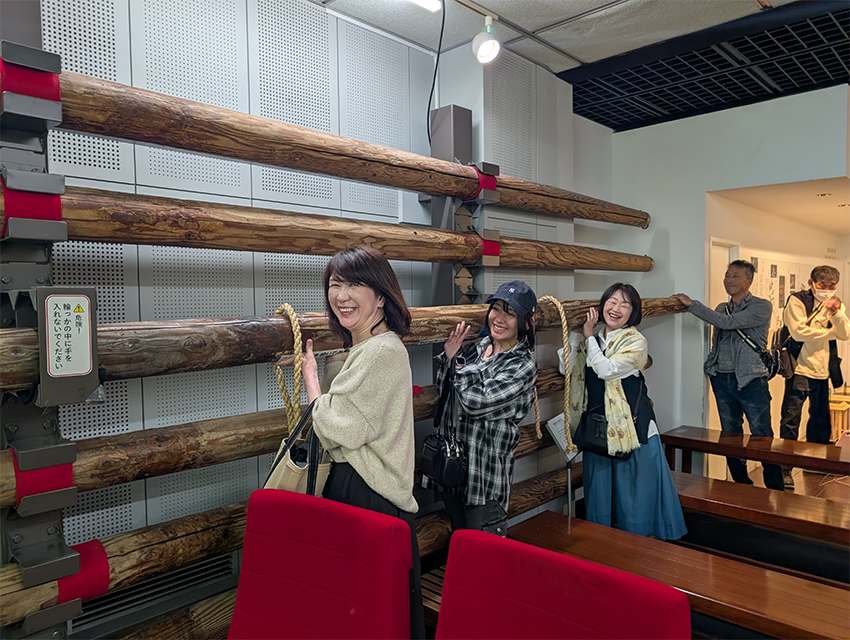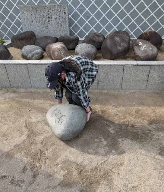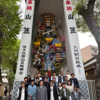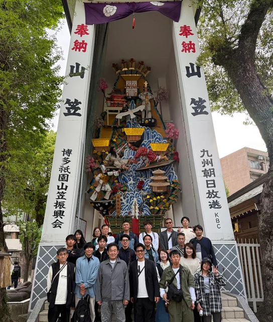 櫛田神社の境内に展示された「飾り山笠」の迫力に圧倒され、そして力石にもみんなで挑戦し、少し持ち上げることができた社員も!?(本人談)