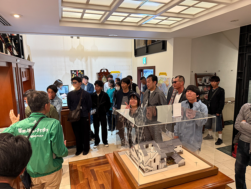 その後、博多へと移動し、博多町家ふるさと館~櫛田神社に立ち寄り、博多の伝統的な建築物である町家の造りや、明治・大正期の博多の暮らしを学びました。