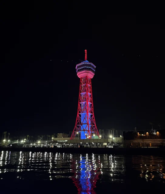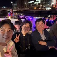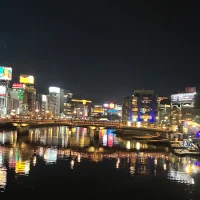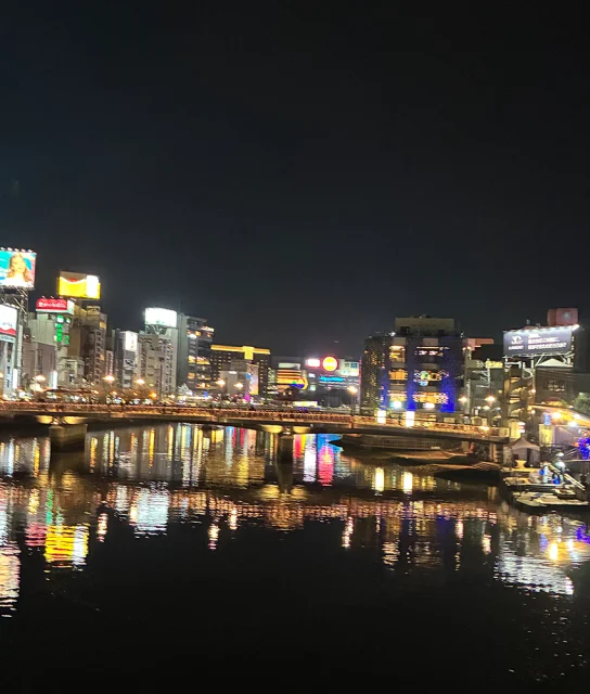 繁華街のネオンで幻想的な雰囲気の中、心地よい潮風を感じながら夜の中州を楽しみました。