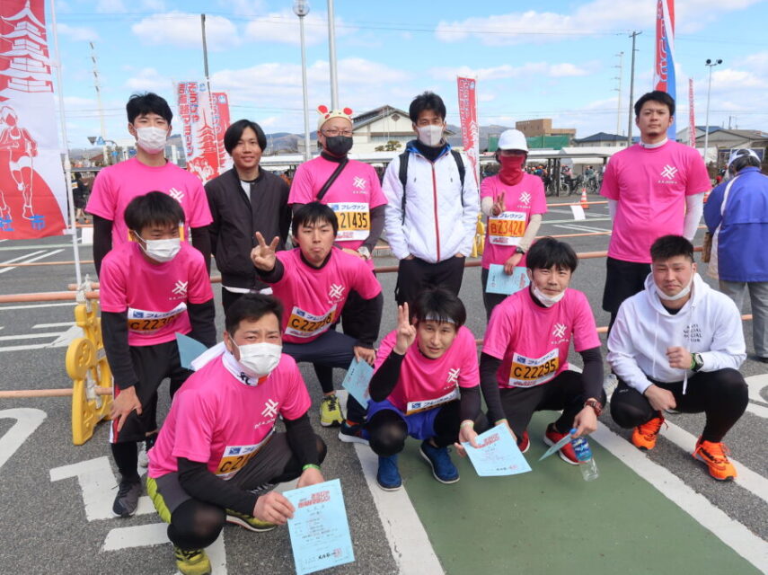 梶岡建設からも13名参加し、お揃いのピンクTシャツを着て10㎞コースを走りました。